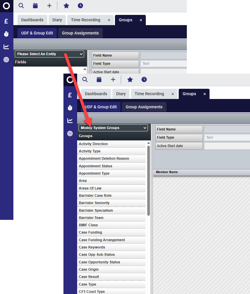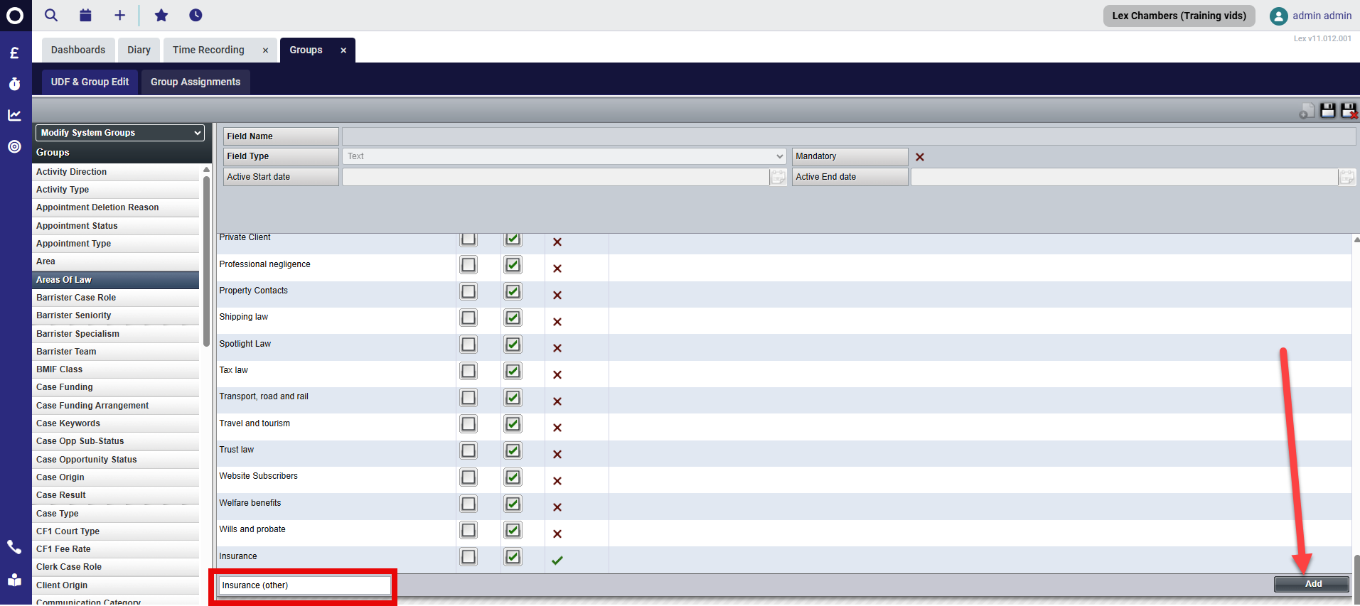 The below example looks at Areas of Law within the contact profile. Each member of this group can be edited or de-activated as required. Making a field inactive just means this option is no longer selectable within the contact profile, the previously assigned data still sits within the contact record.